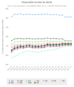 We have used UKMOD, the free tax-benefit calculator for the UK and its constituent regions, to monitor the distributional and budgetary effects of the Covid-19 crisis, month by month from March 2020 to December 2021. The results, published in our interactive Covid-19 Policy Response Dashboard, show a large negative impact of the Covid-19 crisis on equivalised household disposable incomes in the second quarter of 2020 (with a 4.5 percent reduction in mean income in April 2020), followed by a period of stagnation and a steady trend towards recovery starting from April 2021. Overall, the bottom decile has gained significantly due to the anti-crisis public support (with a 30% percentage increase in income, although starting from a very low baseline), while the top decile ended 2021 with an income loss compared to pre-pandemic.