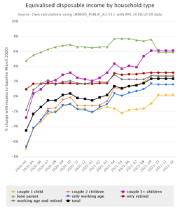 Some particularly vulnerable household types, such as couples with 3+ children and lone parents, jobless and one-earner households, households with the disabled and social renters have seen an increase in their disposable incomes throughout 2020-2021. At the same time, couples with 1-2 children and households of working age adults have experienced an income decline throughout 2020 and even long after that. For instance, incomes of couples with 1 child have not returned to their pre-pandemic level until October 2021. (Note that these numbers are not adjusted for inflation and do not account for housing costs, therefore could underestimate the full negative impact of the pandemic on household incomes.)
