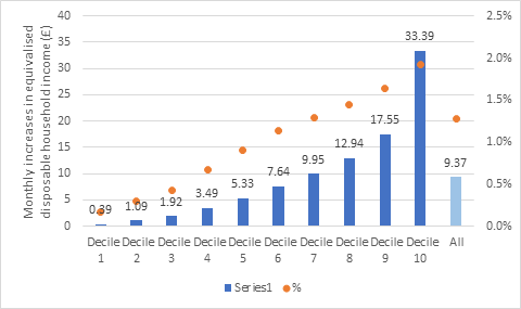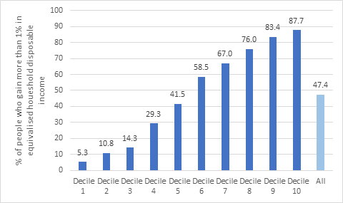 The richest decile will still gain from the measure almost 100 times more than the poorest decile in absolute terms, and more than 10 times in percentage terms (Figure 1).