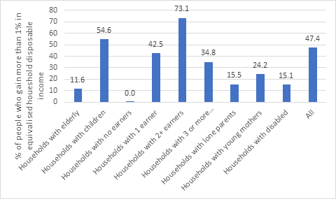 Gains of more than 1% of equivalised disposable household income would be ubiquitous in the richest deciles and rare in the poorest (Figure 2), with more disadvantaged households composed of elderly people, lone parents, young mothers, or disabled, and households with no earners virtually excluded from the largesse (Figure 3).