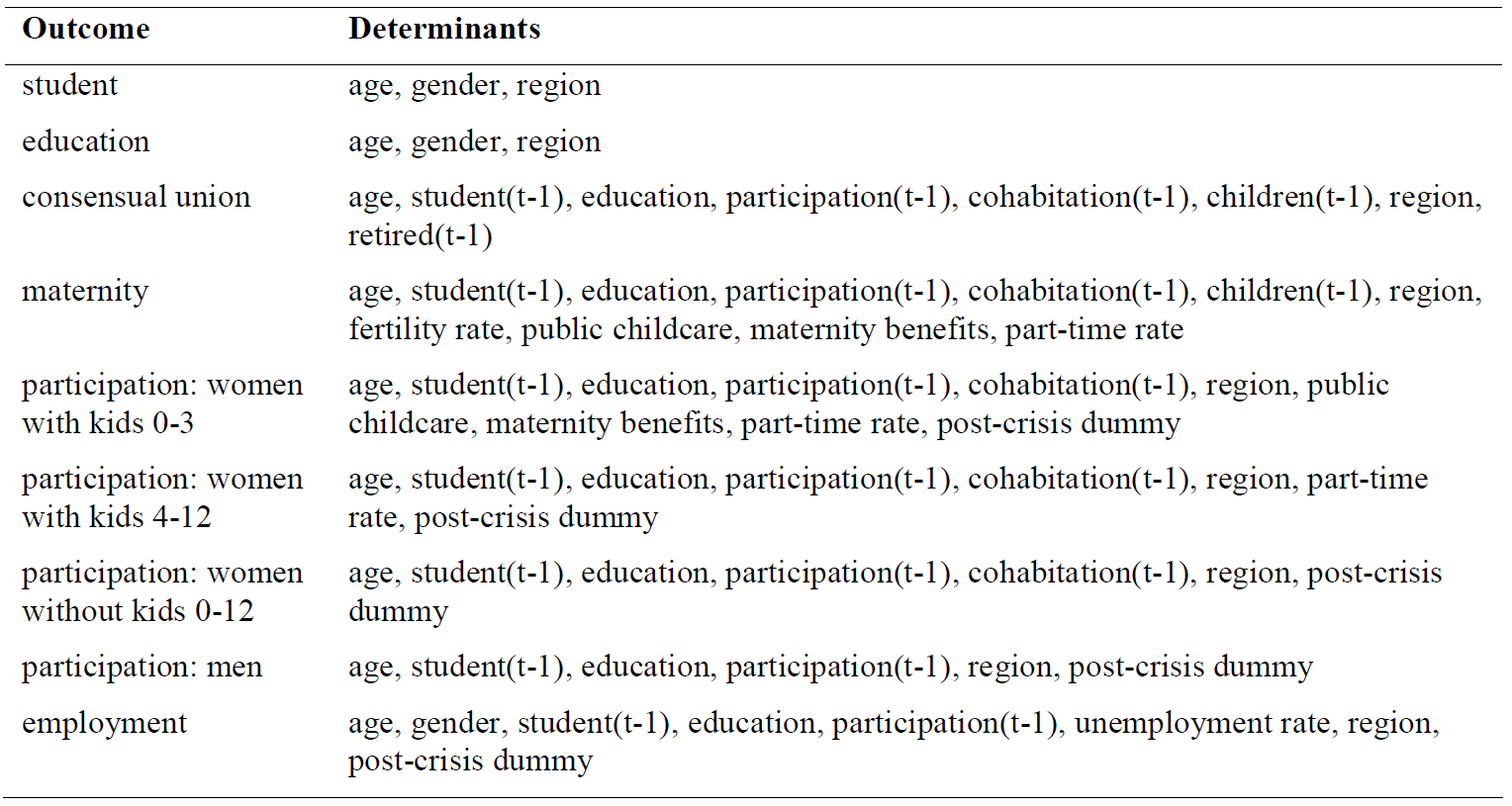 The table below lists all the equations estimated in the model, identifying outcome variables and determinants. The equations are estimated on the 2005-2011 waves of the EU-SILC longitudinal panel.