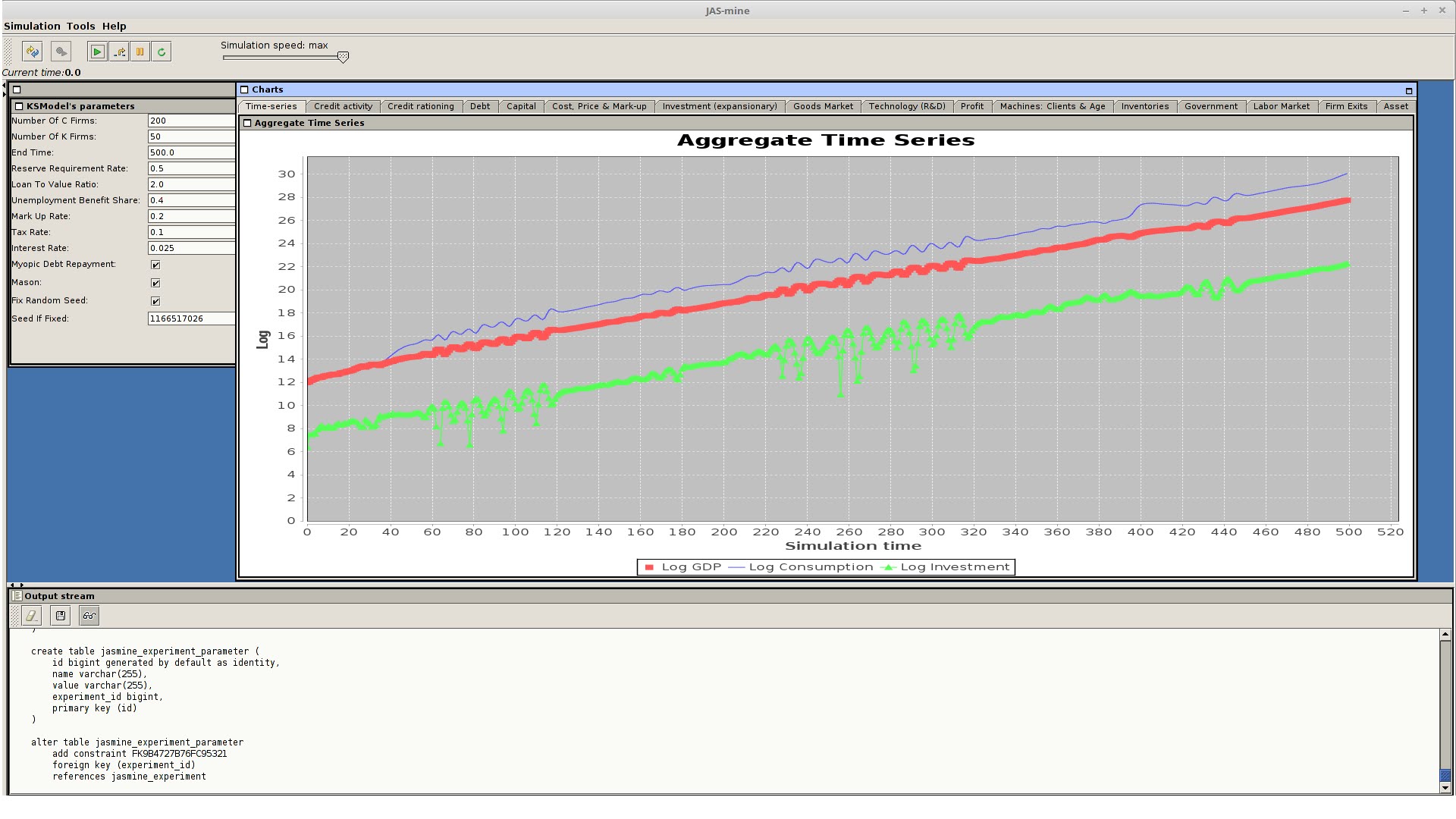 This macroeconomic-financial model is inspired by the agent-based model described in the paper “Income distribution, credit and fiscal policies in an agent-based Keynesian model” (Dosi, Fagiolo, Napoletano and Roventini, 2013), which extends work presented in “Schumpeter meeting Keynes: a policy-friendly model of endogenous growth and business cycles” (Dosi, Fagiolo and Roventini, 2010), both published in the Journal of Economic Dynamics and Control.  We refer the reader to both papers for more information on the background and theoretical roots of the model, as this description focuses on the implementation of our reinterpretation of the model in JAS-mine.