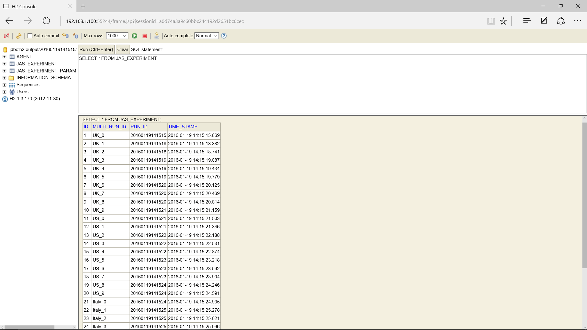 The setupRunLabel() method provides a unique MULTI_RUN_ID name for each simulation run, which could signify a parameter in the model such as the country represented in the simulation for example; it is stored in the output database in the JAS_EXPERIMENT output table, as in the screenshot below: