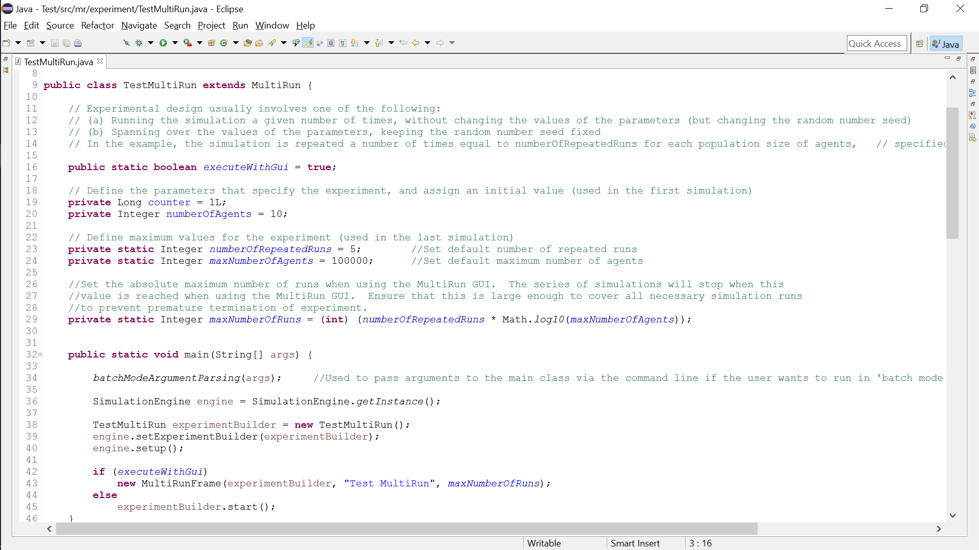 The MultiRun functionality of JAS-mine is created by a wrapper class that wraps around the model, thus removing the need to change any of the internal workings of the model itself. A MultiRun template class is included in the new JAS-mine project created using the JAS-mine Plugin for Eclipse IDE, so that users can see the general structure of a MultiRun class: