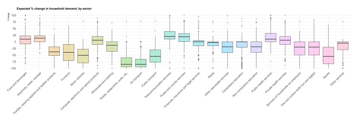 In the first question, respondents were asked to indicate what % change they expect in the final demand of households for the goods or services of the 23 sectors listed in the first column of the table below. Below we report the summary statistics as well as boxplots. Respondents expect largest negative changes to occur in hospitality, transport good and services, and sports. On the other hand, on average, the household demand for telecommunication services, postal services, and utilities is predicted to increase by approximately 20%.