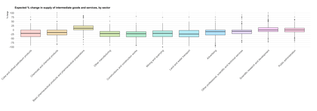 In the second question, respondents were asked to indicate what % change they expect in the supply of intermediate goods and services to businesses in the 11 sectors listed in the first column of the table below. Below we report the summary statistics as well as boxplots. Supply of intermediate goods in all sectors, except for basic pharmaceutical products and preparations, is expected to decline by 10-25%.