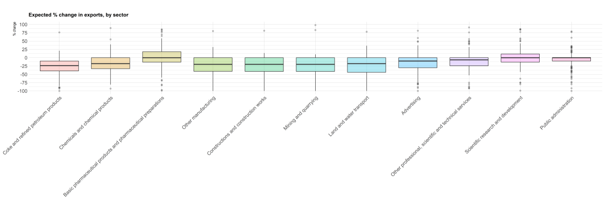 In the third question, respondents were asked to indicate what % change they expect in the export of intermediate and final goods in the 11 sectors listed in the first column of the table below. Below we report the summary statistics as well as boxplots. The expected effect of the lock-down measures on export of intermediate and final goods is non-positive for all sectors. Export of coke and refined petroleum products is expected to decrease the most, by 24%.