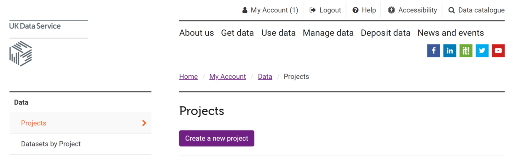 if you do not already have a project which makes use of the FRS data, or to which FRS data could be added. To create a new project, go to Data > Projects using the left-hand side menu and click on ‘Create a new project’: